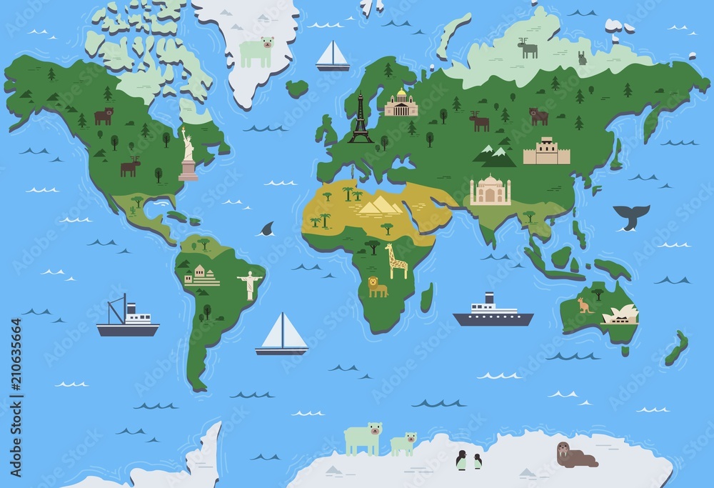 Stylized World Map With Tourist Attraction Symbols. Simple